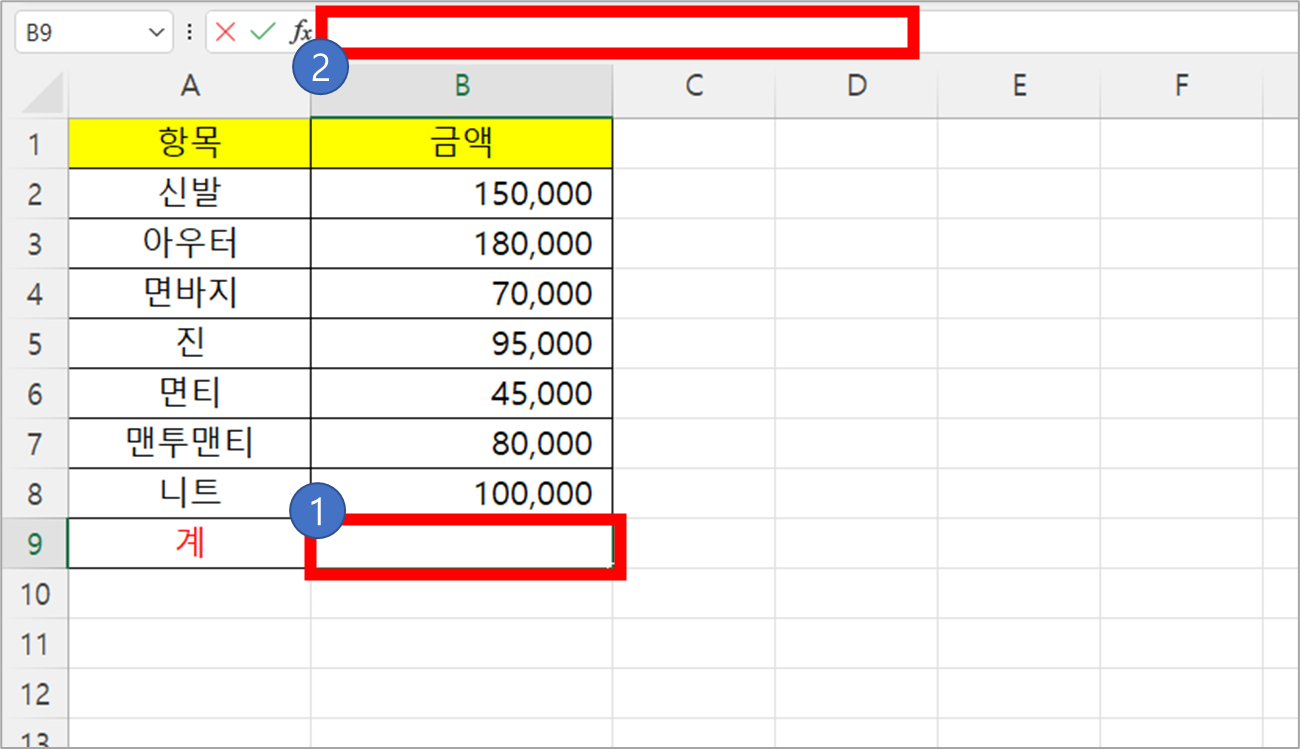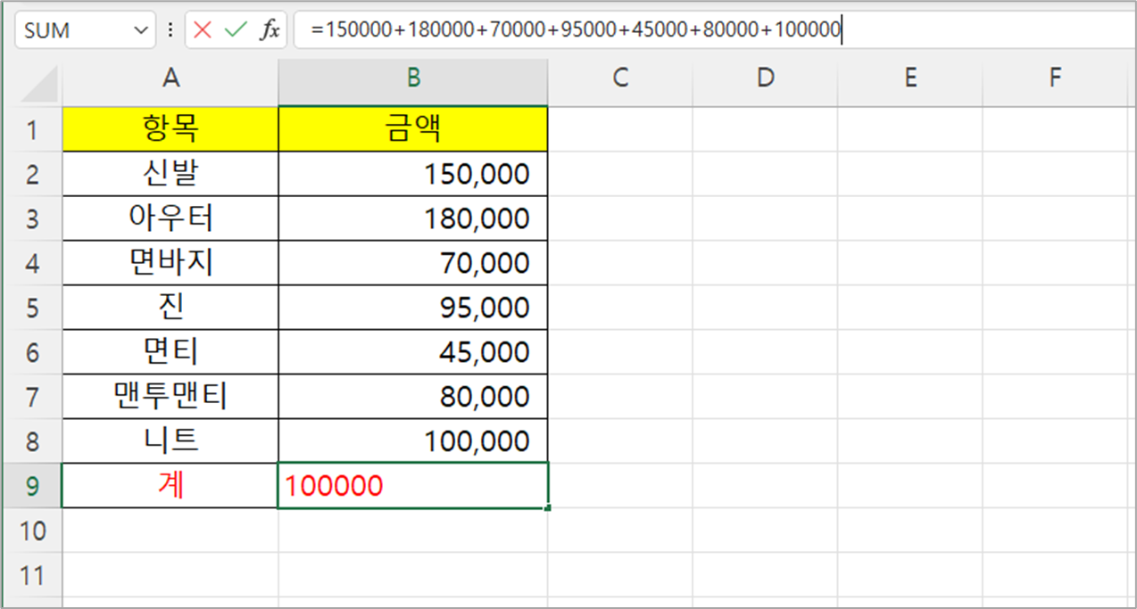 A9 항목인 '계'의 오른쪽 칸인 B9 칸에 결과값이 나오도록 수식을 넣고 싶다고 생각해봅시다. 그렇다면 가장 직접적인 방법으로 값을 구한다면 해당 B9 칸에 신발, 아우터, 면바지 등의 금액을 모두 더하는 덧셈식을 넣으면 산출할 수 있습니다. 그것을 아래와 같은 덧셈식으로 만들 수 있습니다.